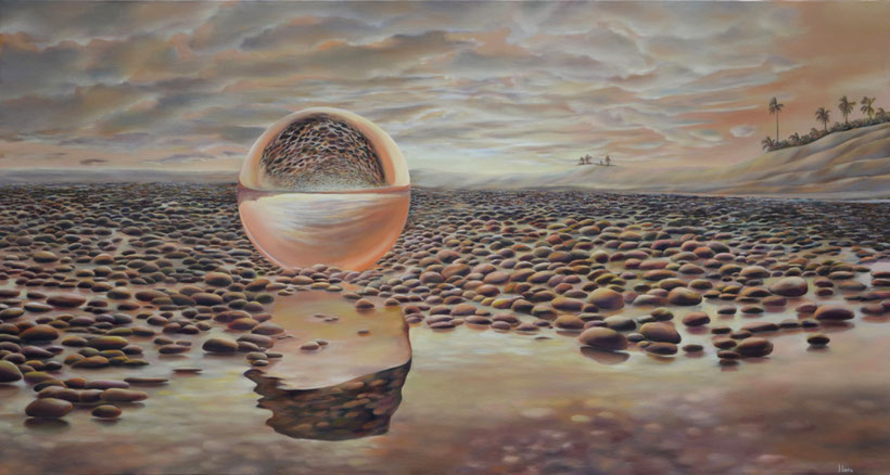 Enseguida aparecen sus bodegones, donde hace una parodia entre las peras y los focos y empezamos a sentir con más énfasis su interés e inclinación definitiva por el hiperrealismo, al exaltar los brillos, por ejemplo, y mostrarnos ese dialogo entre lo real, lo natural y lo industrial: parodia que caracterizará de muchas de sus representaciones pictóricas. Vemos así mismo una serie de esferas (¿de vidrio?) en materias naturales: palmeras, cocos, agua, arena, aves, frutas y otros elementos que el artista siente la necesidad de dejar plasmados sobre sus telas donde, una vez más, establece el diálogo o la parodia, diría yo, ente lo tangible y lo intangible.